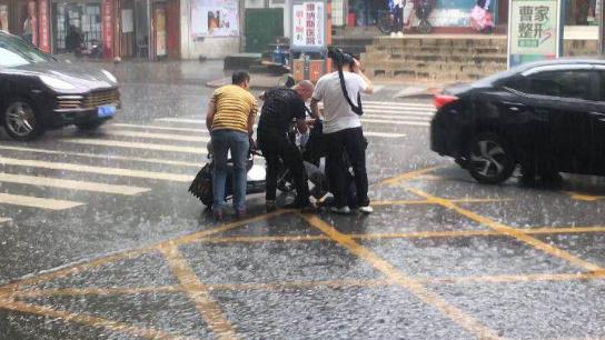 4月26日中午13:10,郴州市区电闪雷鸣,大雨瓢泼,在人民东路郴州市保安服务公司大门口屋檐下,挤满了临时躲避雷雨的市民。突然“吱”的一声刺耳的刹车声,伴随着“轰”的一声响,一名电动车主为避让雨中飞奔的学生,在飞速过程中摔倒在地,伤者被电动车压在车下,一动不动。
