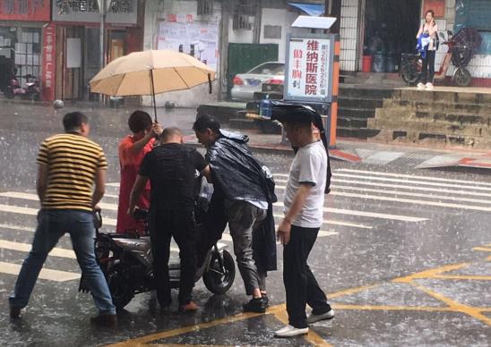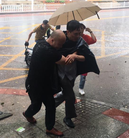 前来参加郴州市保安服务公司党支部主题党日活动的基层党员,来自安仁大队的张锋,宜章大队的黄勇正在不远的屋檐下躲避雷雨,他们察觉到情况不妙,拨开人群顶着大雨冲到伤者面前,察看伤者情况,在他们的感染下,热心市民也伸出了援手。看伤者有了动静,为避免车辆路过发生二次伤害,众人将伤者搀扶到安全地带询问伤势。