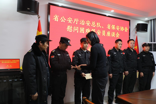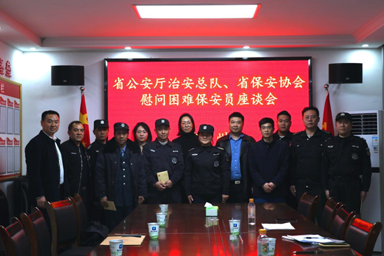 座谈会上,慰问组人员与困难保安员进行了亲切交谈,倾听他们的心声与需求,深入了解困难保安员所在岗位工作情况,以及致困原因和家庭、子女等生活状况,鼓励他们克服暂时困难,保持乐观向上的积极心态,在本职岗位上履职尽责。期间,慰问组代表省公安厅治安总队、省保安协会为每位困难保安员送上了慰问金并合影留念。