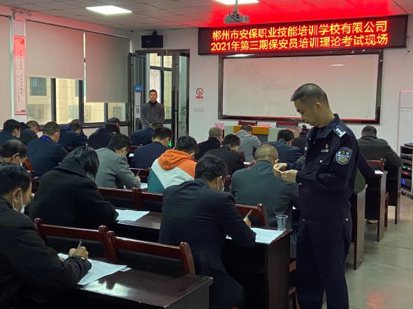 最后,在市公安局治安支队内保大队干警的现场监考下,全体参训人员顺利完成了保安员理论考试。