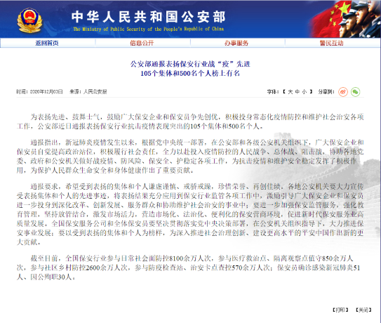 近日,为表扬先进、鼓舞士气,鼓励广大保安企业和保安员争先创优,积极投身常态化疫情防控和维护社会治安各项工作,公安部通报表扬保安行业抗击疫情表现突出的105个集体和500名个人。其中郴州市保安服务公司办公室主任黄存名同志榜上有名,荣获“全国抗击疫情表现突出个人”。