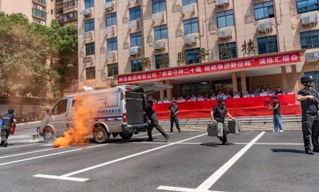 8月25日,永兴集团yx08公司举行“武装守押二十载,砥砺奋进新征程”演练汇报会。郴州市公安局党委委员、副局长祁永忠,郴投集团党委副书记、总经理郭庆锋出席汇报会并讲话。郴投集团党委副书记、监事会主席李洪斌,市公安局矿管支队支队长郭丽华、治安支队支队长宁新明等监管单位领导,全市各银行客户单位嘉宾参加观摩。