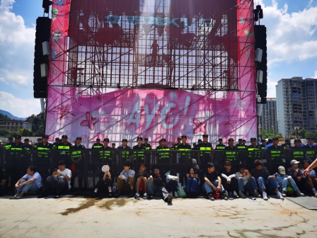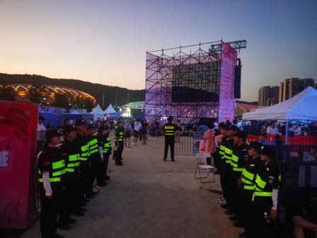 2025年10月国庆中秋节3日,AYO音乐节在郴州xxxx 开唱,超强阵容齐聚,首场高能开唱,数万乐迷齐聚现,备受瞩目的音乐节在郴州拉开帷幕。郴州市保安服务有限公司作为本次活动安保主力军,在郴州市公安局的统一指挥和指导下,以“最高标准、最严要求、最优服务”为核心准则,全程守护数万乐迷的狂欢时刻,在音乐节第一天用专业与坚守交出了一份零事故、零差错的满意答卷。