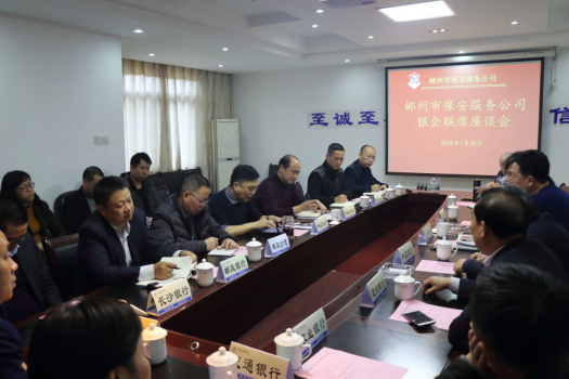 为构建长期稳定的银企关系,加强银企之间的沟通交流,进一步搭建银企真诚友好的合作平台,及时发现问题,查找不足,确保银保守押工作安全、规范,实现银企合作互惠共赢,2019年1月30日下午,在公司三楼会议室,召开了金融单位银企联席座谈会。应公司领导的盛情邀请,我市工行、建行、农行、中行、邮政银行、交通银行、长沙银行、华融湘江银行主管安全保卫的负责人出席了会议。